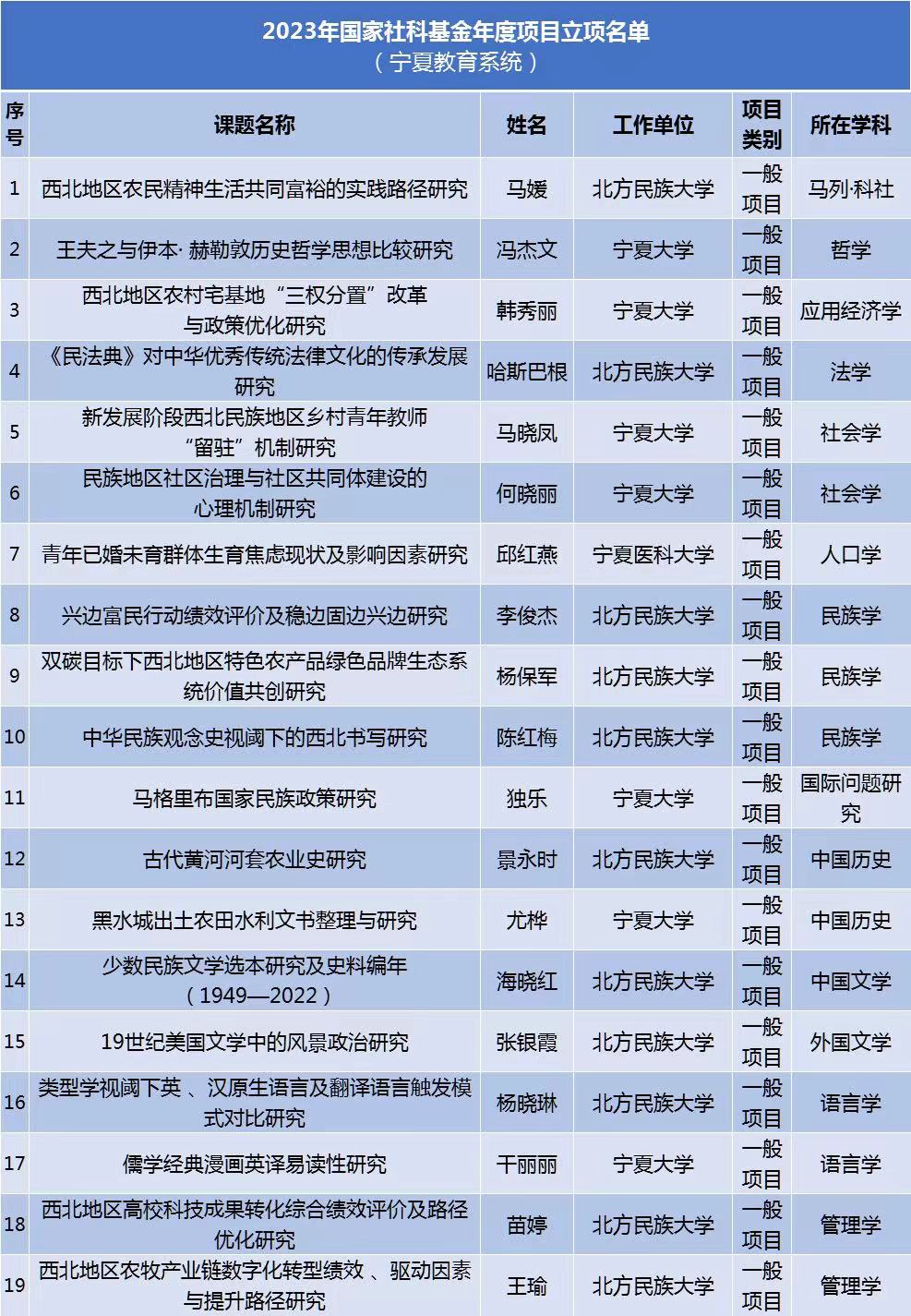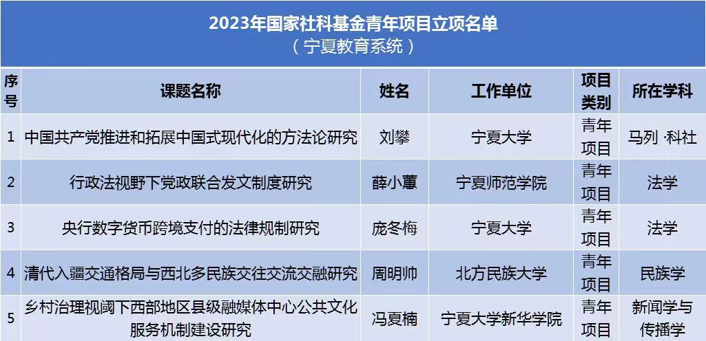 9月22日,全国哲学社会科学工作办公室公布了2023年国家社科基金年度项目和青年项目立项名单。宁夏教育系统19项年度项目、5项青年项目入选。